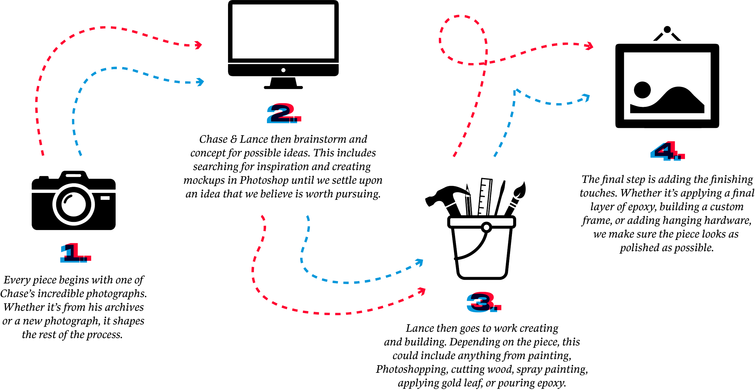 With backgrounds in photography, graphic design, and fine art, they transform 2D photos into 3D contemporary art; utilizing a variety of mediums including wood, gold leaf, and acrylic paint.